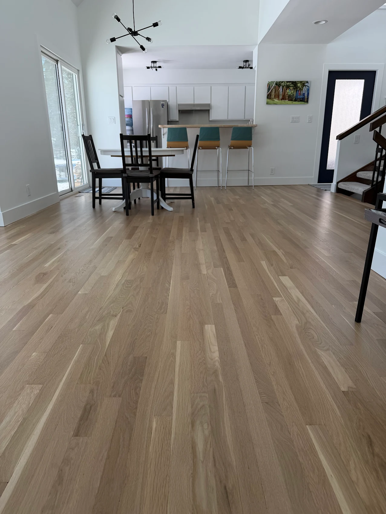 Worn, graying white oak floors were fully sanded and refinished as the final step of a main-level remodel to restore protection and unify the space.