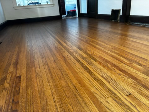 Scratched red oak and maple floors in a former rental were fully sanded, stained, and refinished to clean them up and create a more cohesive look before the homeowners moved back in.