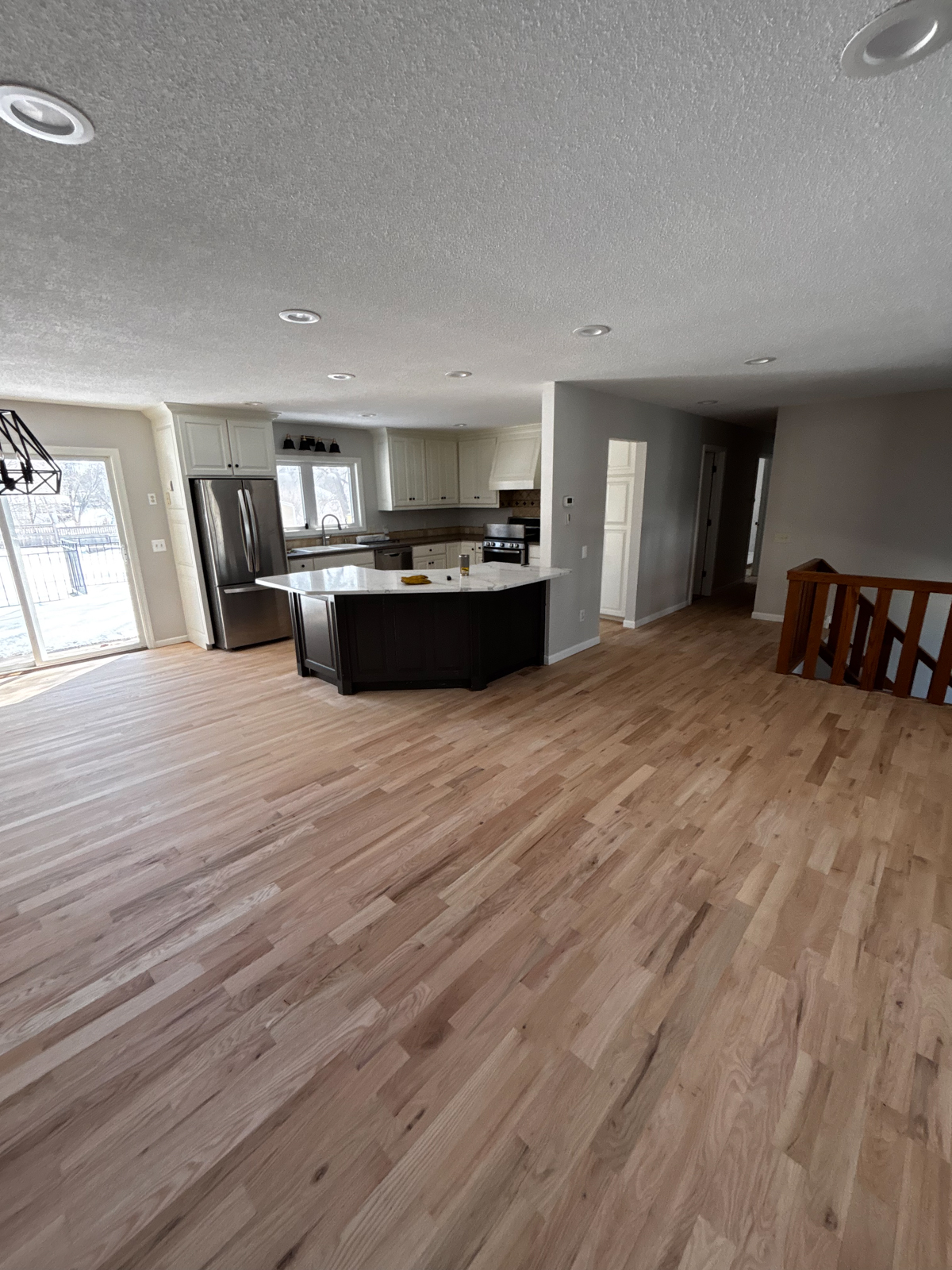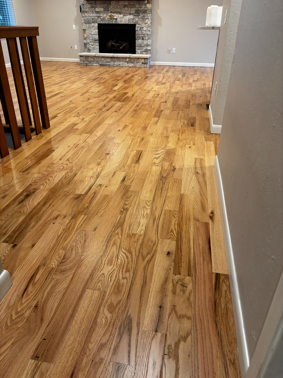 A vacant Excelsior rental with two species of red oak—worn from years of use and large dogs—was fully sanded and refinished with an Amber Prime sealer system to blend the two floor types and deliver a clean, like-new result.