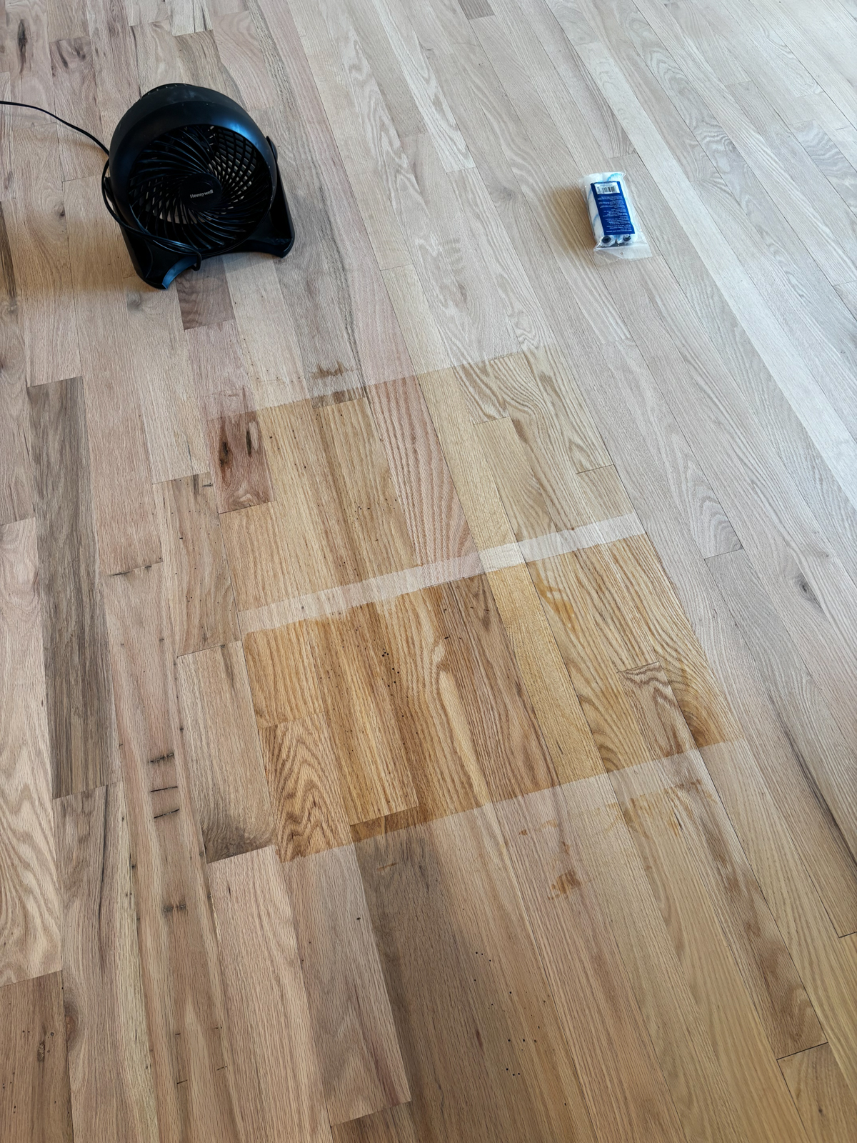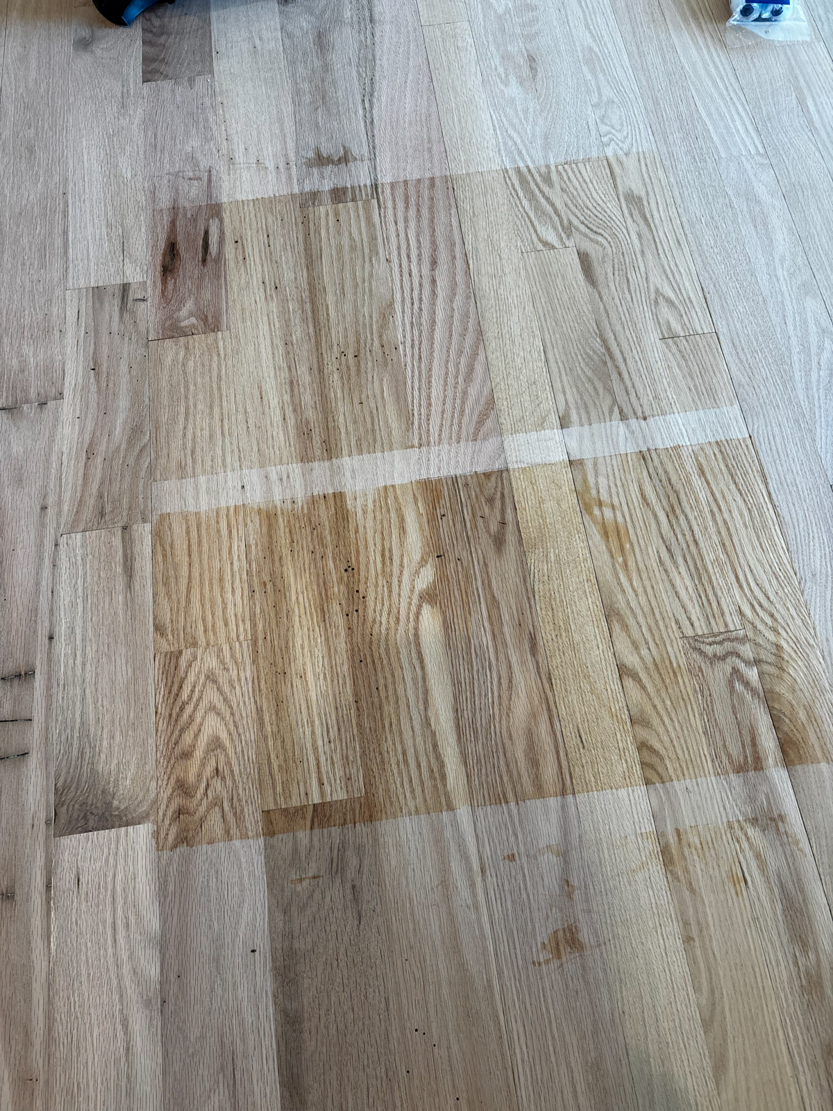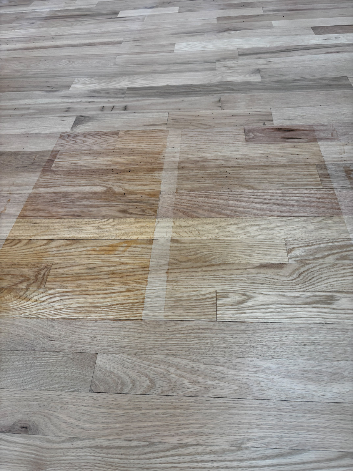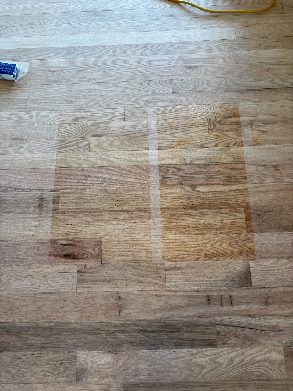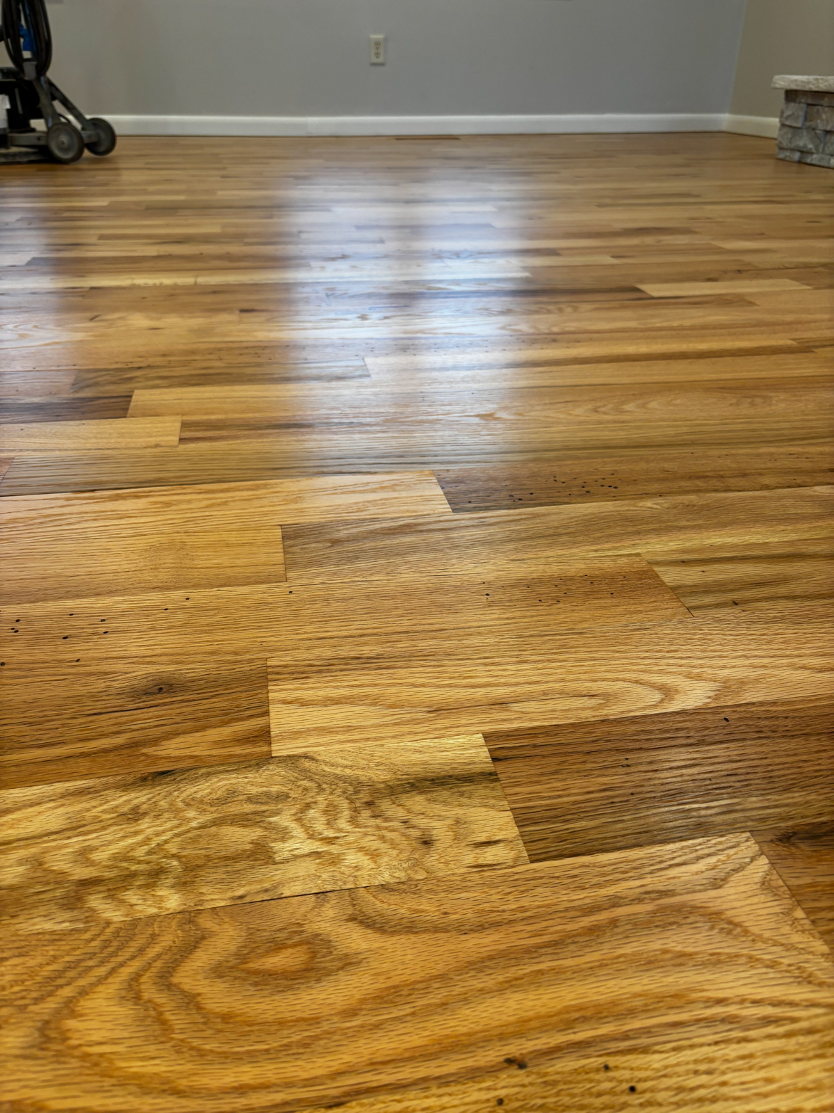Based on that, we recommended a full sand and refinish rather than a buff and coat. The damage was too extensive for a surface-level refresh, and the homeowner wanted the floors to look brand new for the next tenant. To address the visual gap between the two wood types, we used an Amber Prime sealer. It adds a warm, aged tone similar to what oil-based poly produces—enough depth to bring the two floors into closer visual alignment without applying a full stain color. The homeowner had considered a stain but preferred to keep the cost down, and the amber sealer achieved a similar blending effect. We finished with an Easy Finish satin topcoat.