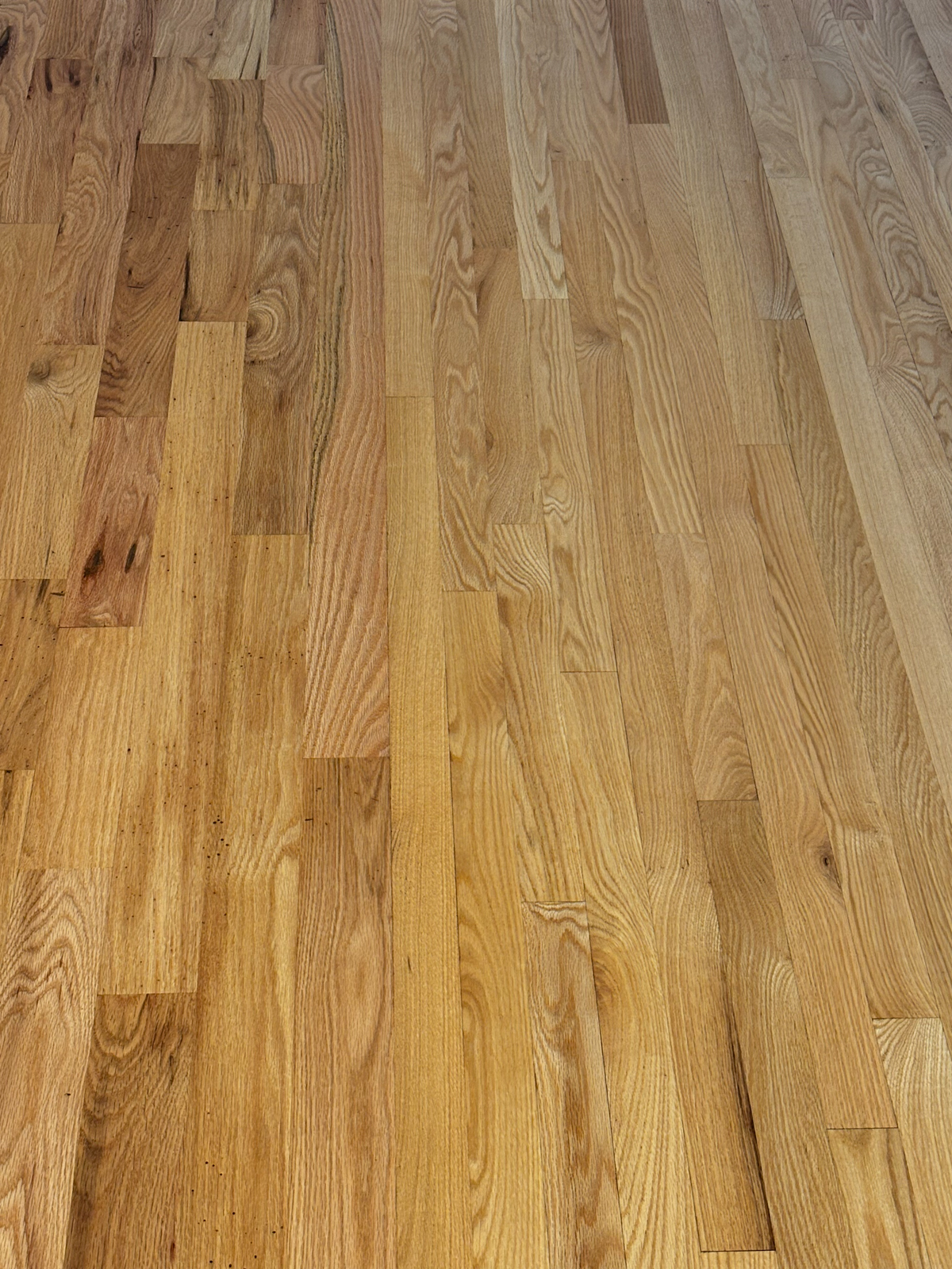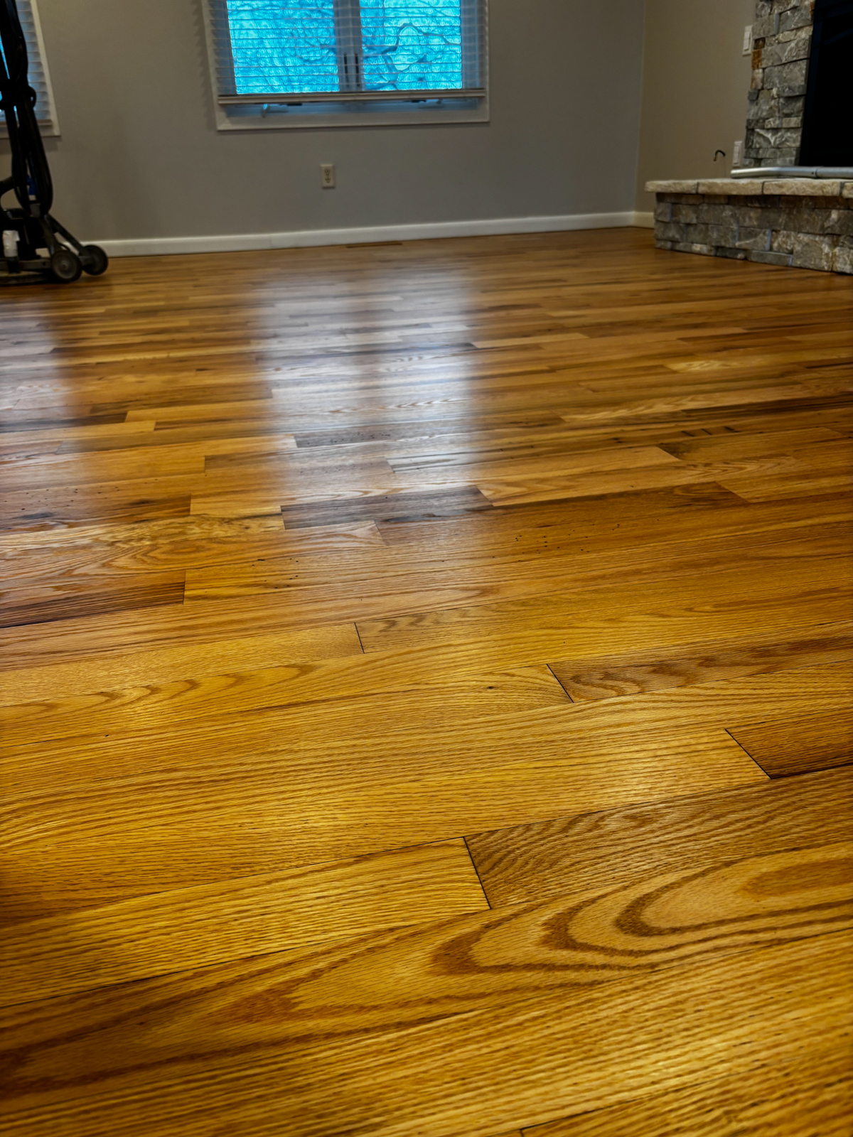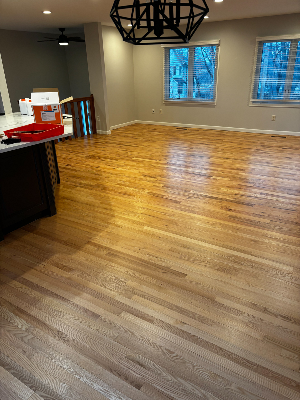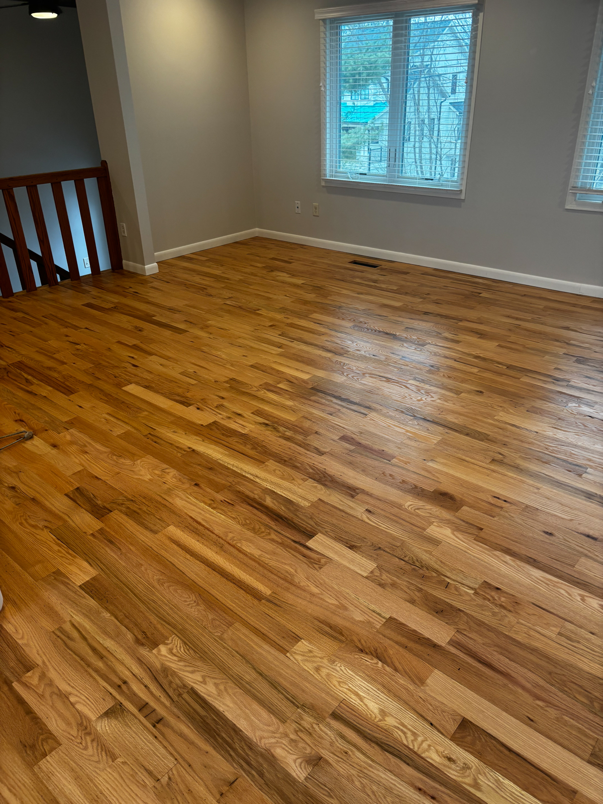 Refinished red oak hardwood floors with an amber-toned, even finish and a durable satin sheen throughout.