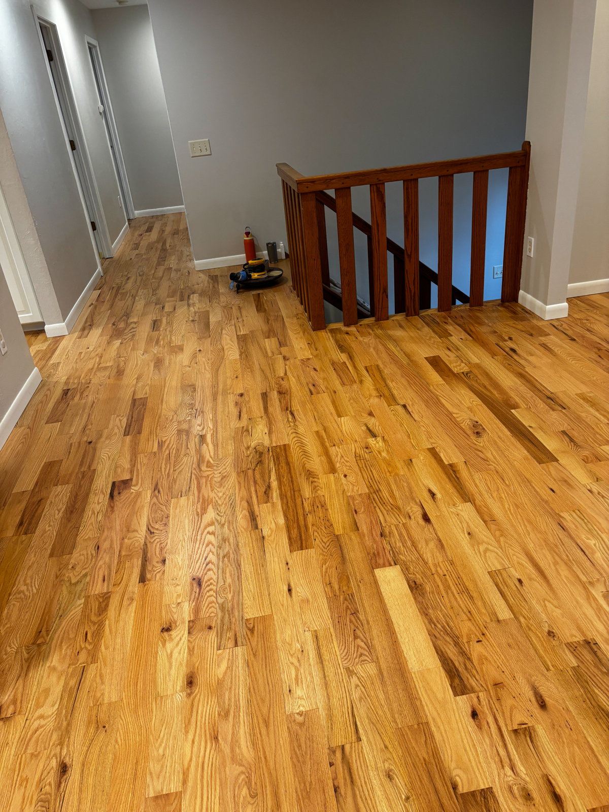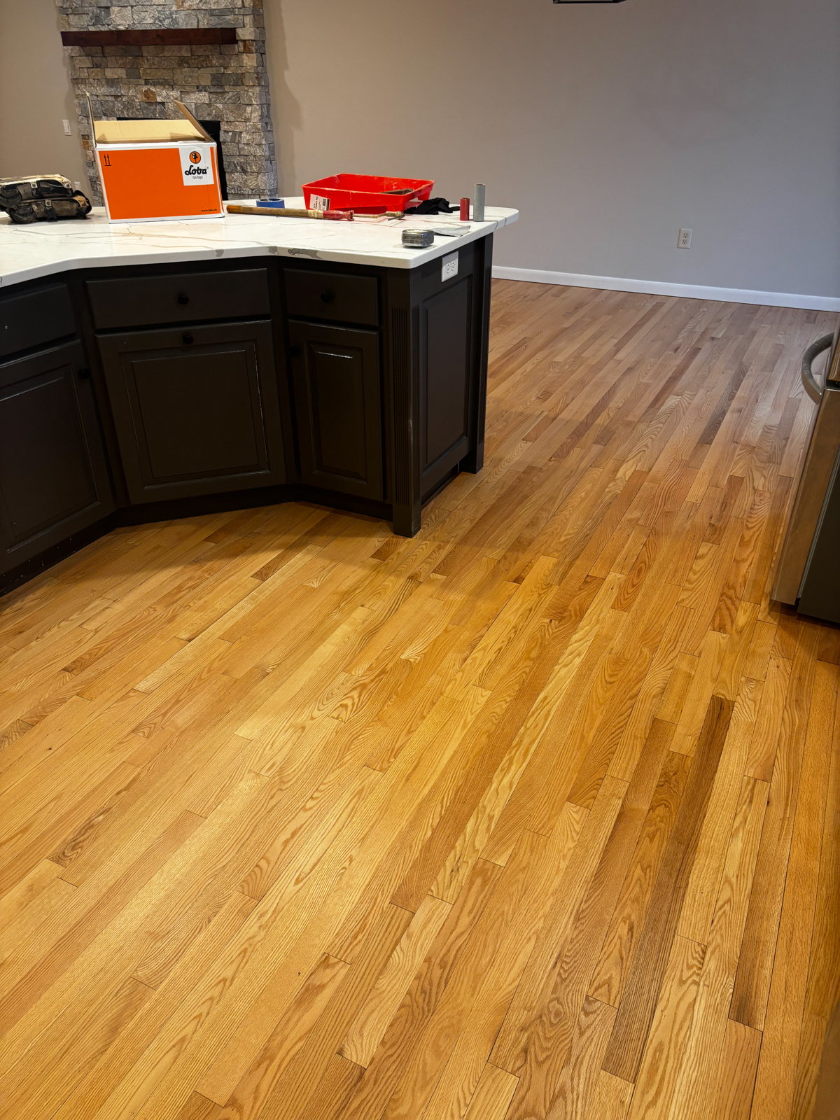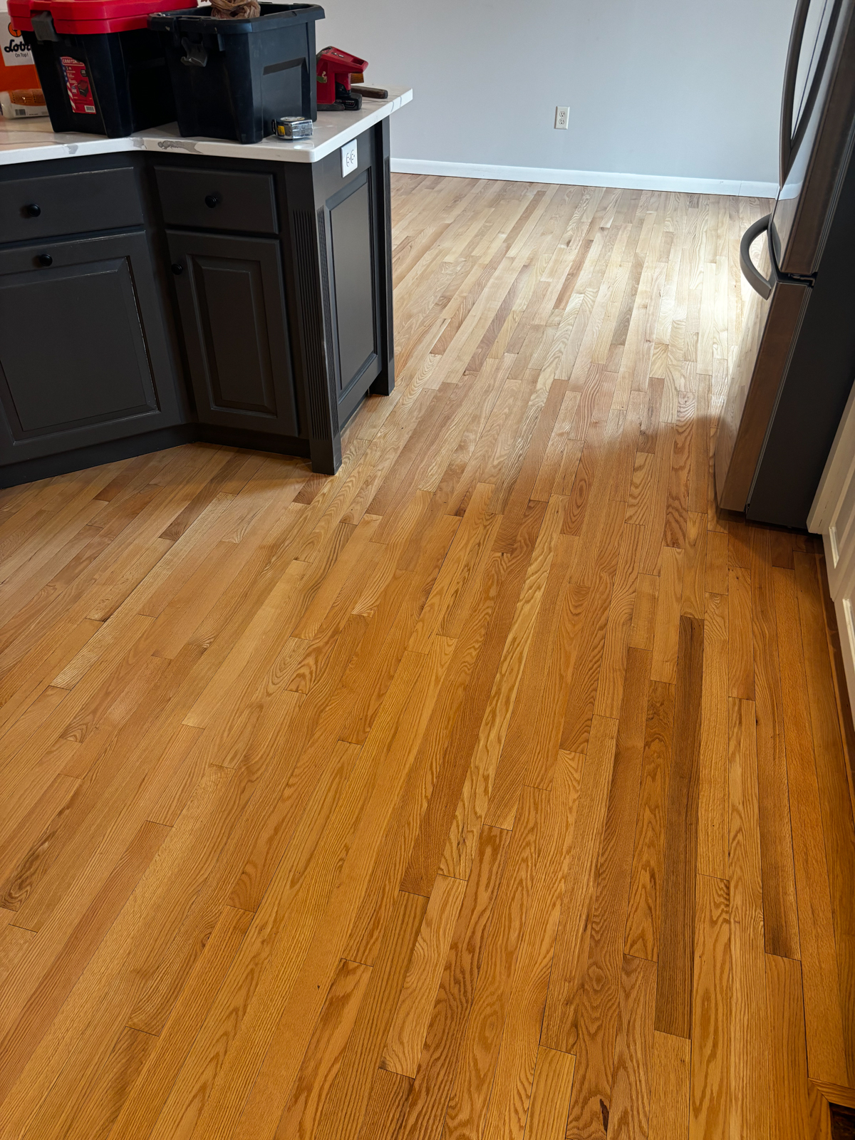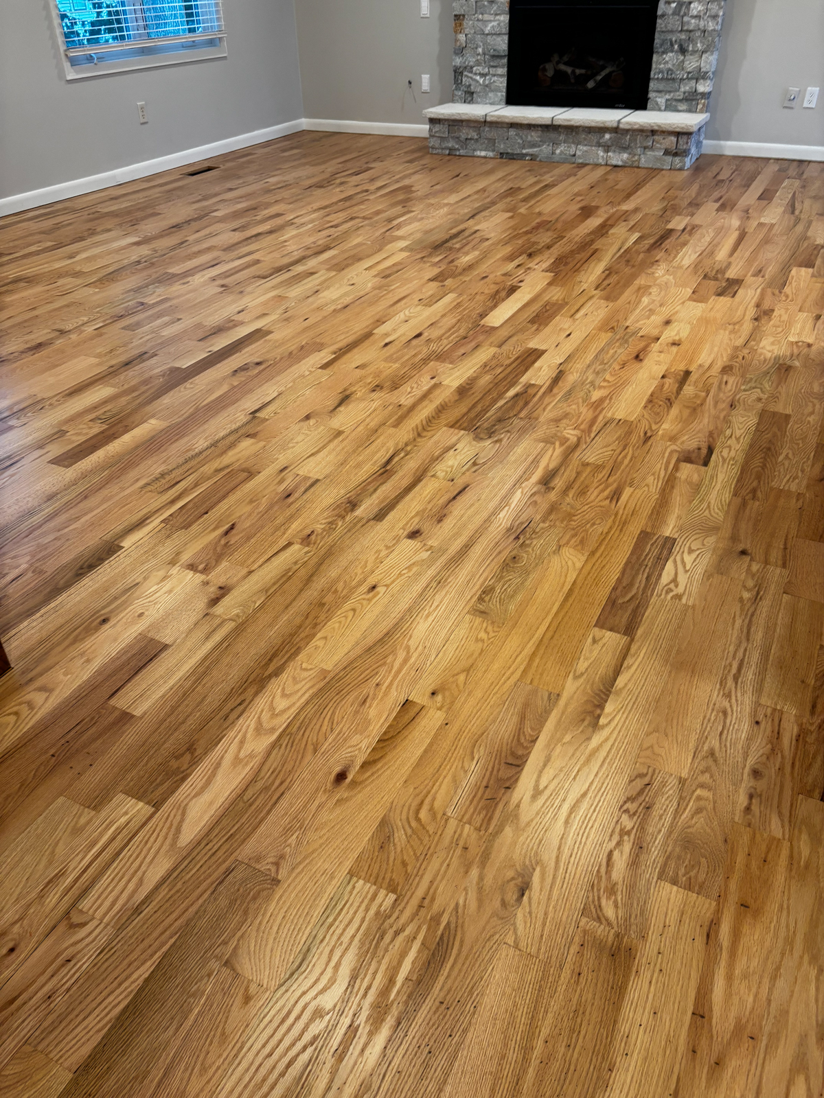 Refinished red oak hardwood floors with an amber-toned, even finish and a durable satin sheen throughout.
