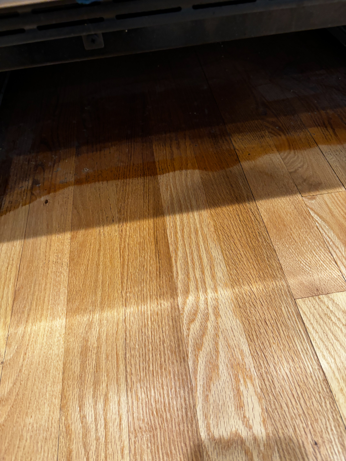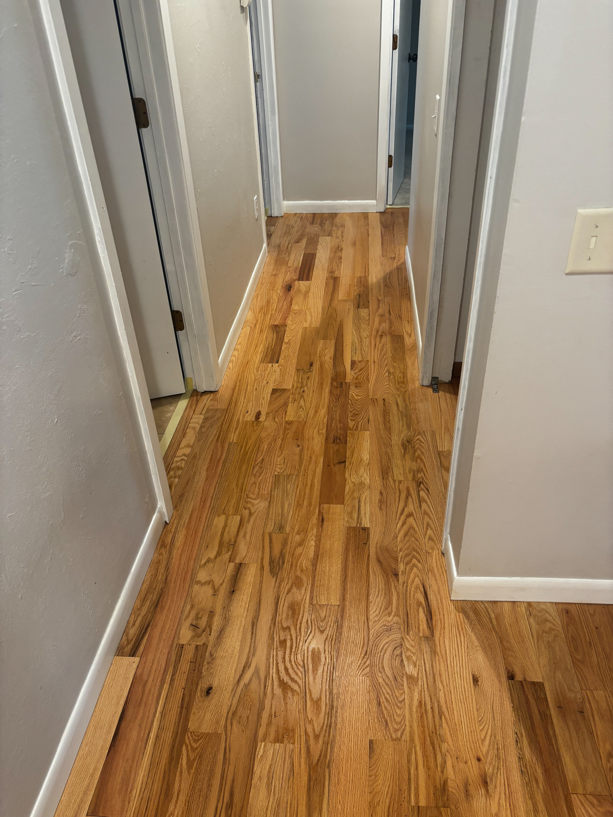 The result was a consistent, warm finish across both floor types. The satin sheen gave the floors enough light to read as clean and fresh without drawing attention to every footprint. The cupped areas flattened out cleanly, and the two wood sections read as a cohesive floor rather than two distinct materials. Any prospective renter walking through the property would see floors that look completely reset.