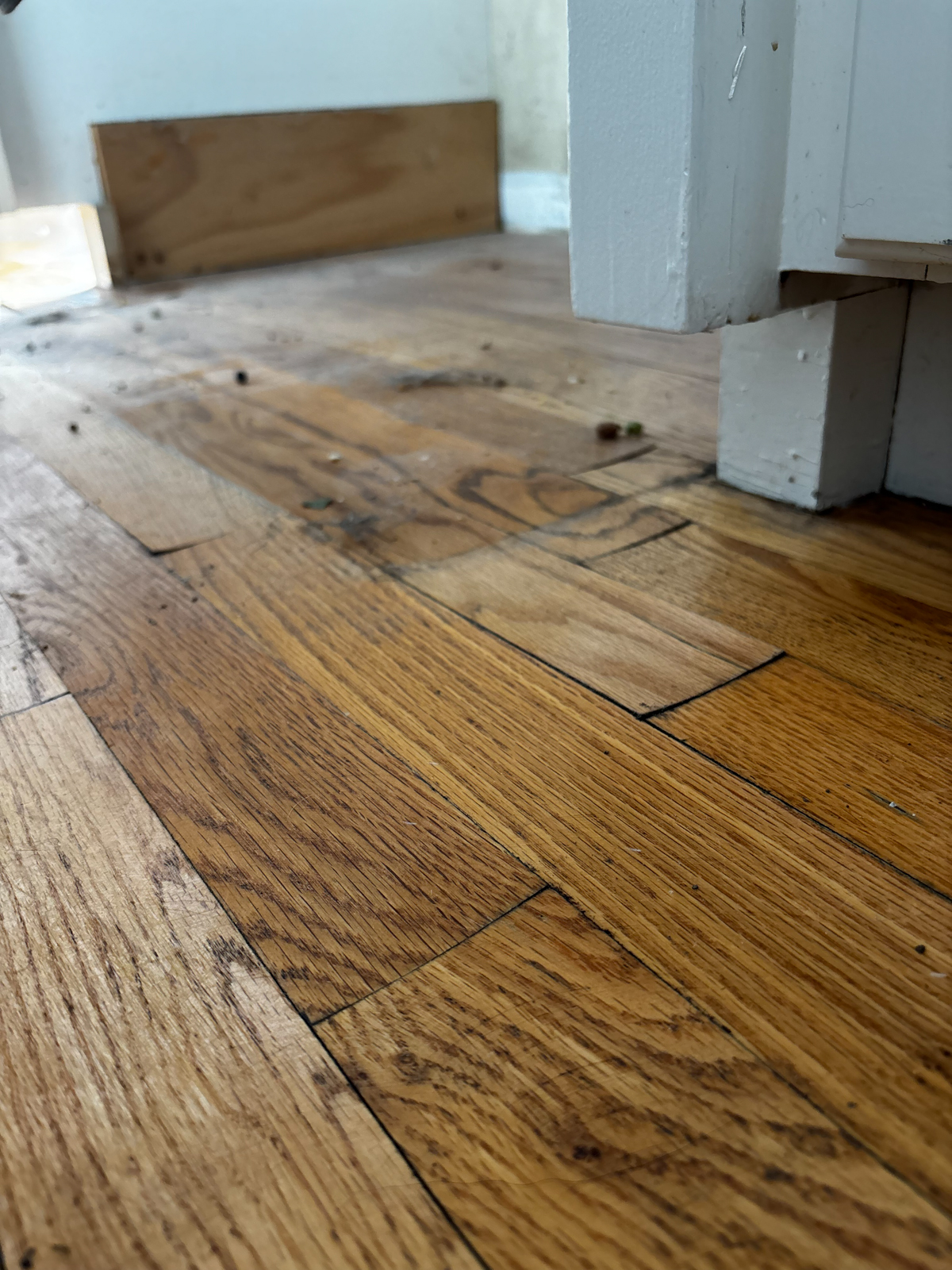 After taking a closer look, we found the water-damaged areas had fully dried out, so no board replacements were needed. We were able to sand down the cupped sections along with the rest of the floor. We also discovered something that wasn't visible in the initial photos: the kitchen and the living room and hallway were two different widths of red oak. The kitchen had 2¼-inch strip flooring, while the other areas were a wider, 3¼-inch character-grade oak. Once the old finish was sanded away, the contrast between the two became more apparent.