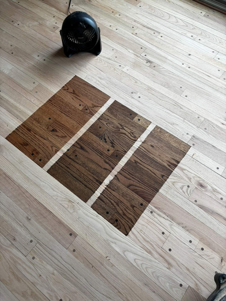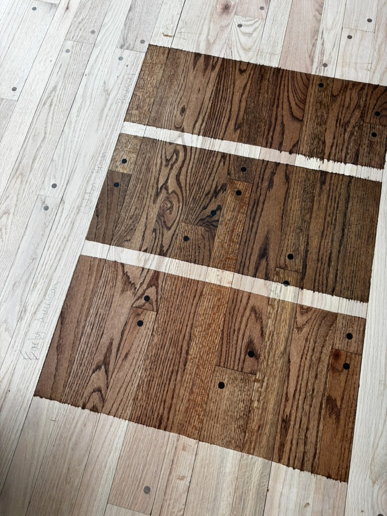 Red oak floors with walnut plug accents, refinished and recolored after storm damage repair