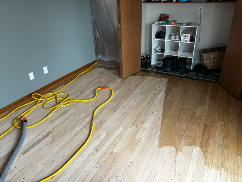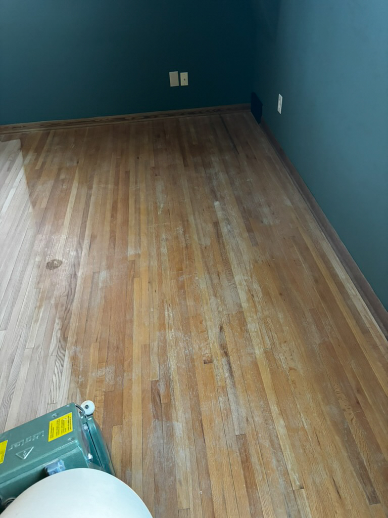 On the upper level, the red oak had been exposed for years. The carpet came up a long time ago, and since then, the floors had just been lived on without any finish. You could see the wear patterns, the gray areas, the spots where the wood had started to dull out. A buff and coat wasn't going to fix this — there wasn't enough finish left to work with. We needed to go all the way down.