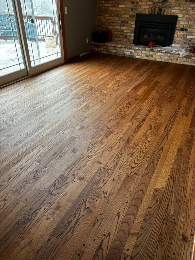 Upper level red oak floors were sanded down and refinished with a clean, protected natural finish. Main level red oak floors received a full sand and an Early American stain that brought the walnut plugs into the surrounding tone, resulting in a consistent, neutral look throughout.