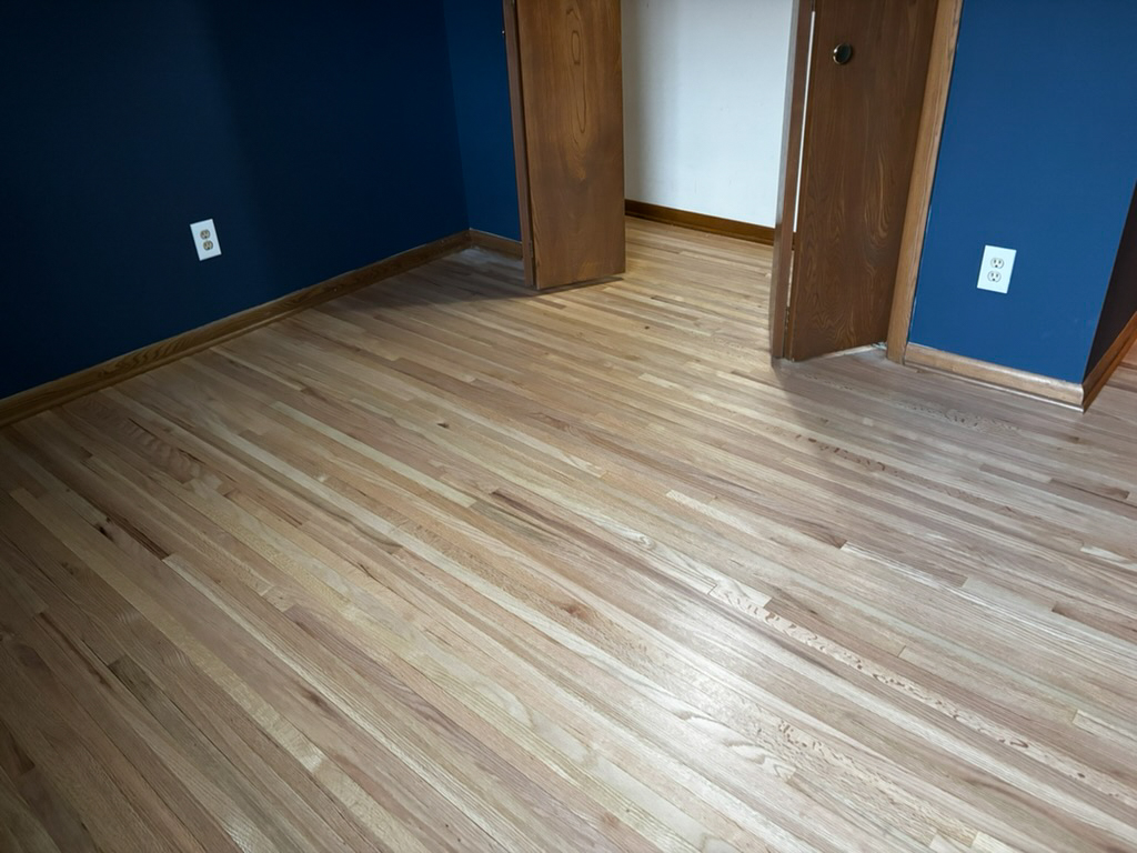 This video covers a full sand and refinish across two levels of a single-family home following a storm damage restoration. The upper level floors had been living without finish since carpet was removed years prior. On the main level, Early American stain was used to neutralize decorative walnut plugs that had been set into the red oak during the original installation. Viewers will see what worn, unfinished red oak looks like before work begins, and what a consistent satin finish looks like once the process is complete.