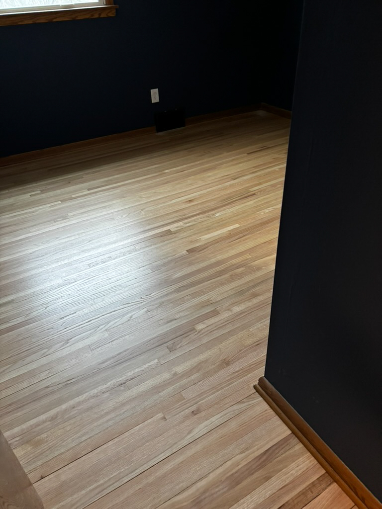 Based on that, we recommended a full sand and refinish on both levels. The upper level floors went back to natural — no stain, just a clean reset. On the main level, we applied Early American stain before finishing to bring the walnut plugs into better visual balance with the surrounding red oak. For the finish, we used Loba's Easy Prime followed by Easy Finish in satin — a water-based single component system chosen for its low odor and faster dry time, which worked well given the family was living in the home throughout the process.
