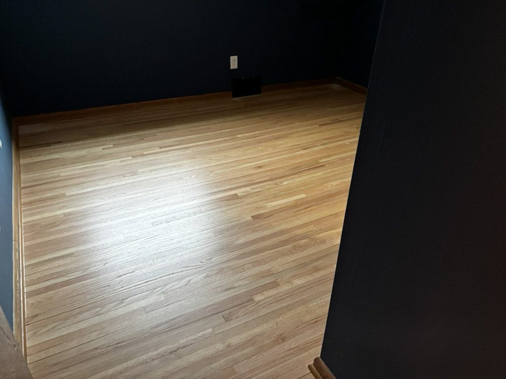 The result was a consistent, protected finish across both levels. The upper level floors looked reset and ready for everyday use again. On the main level, the Early American stain brought the walnut plugs into the floor tone — they were still there, but no longer the first thing you noticed. The whole house read more cohesive once the work was done.